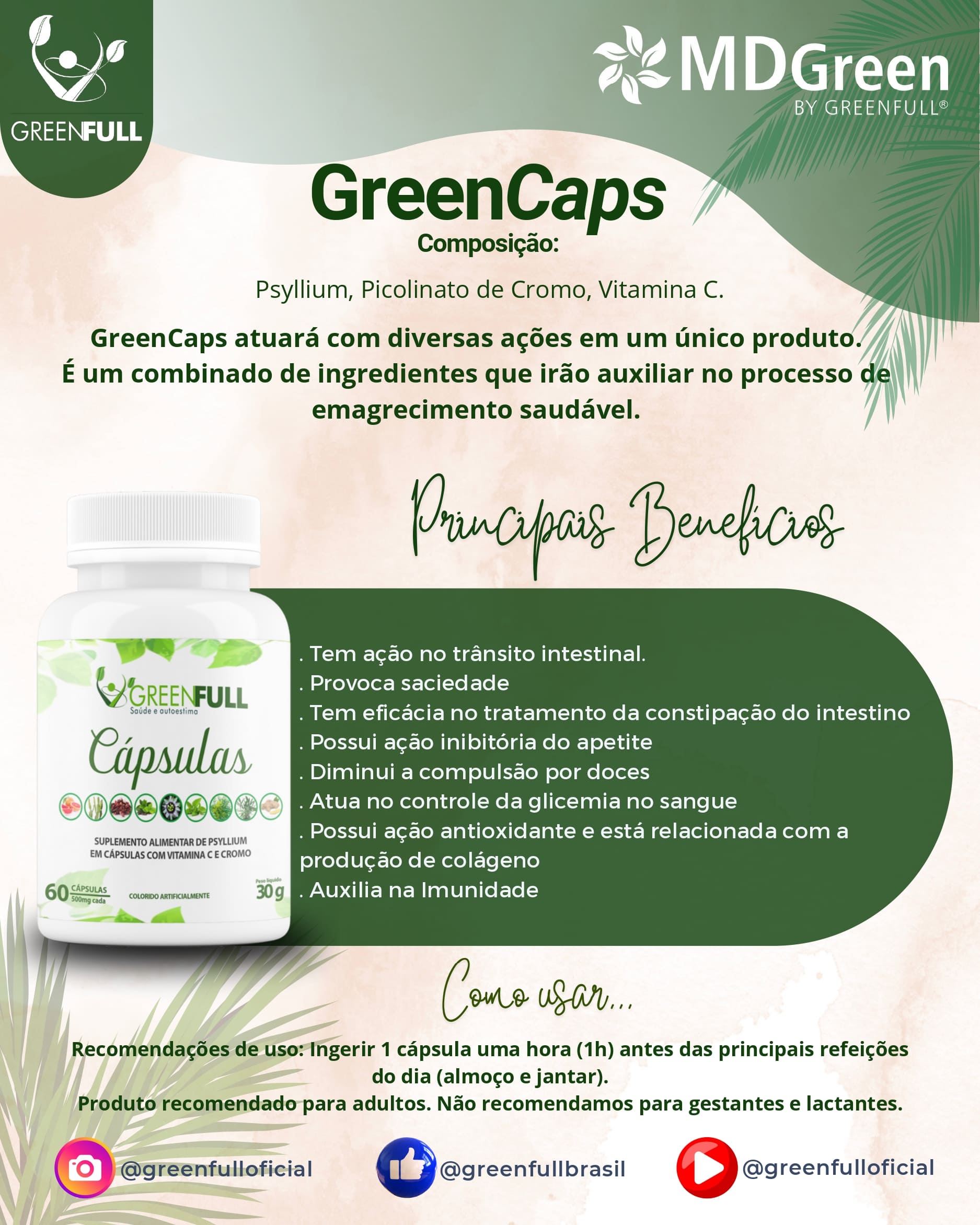 GreenCaps atuará com diversas ações em um único produto. É um combinado de ingredientes que irão auxiliar no processo de emagrecimento saudável.